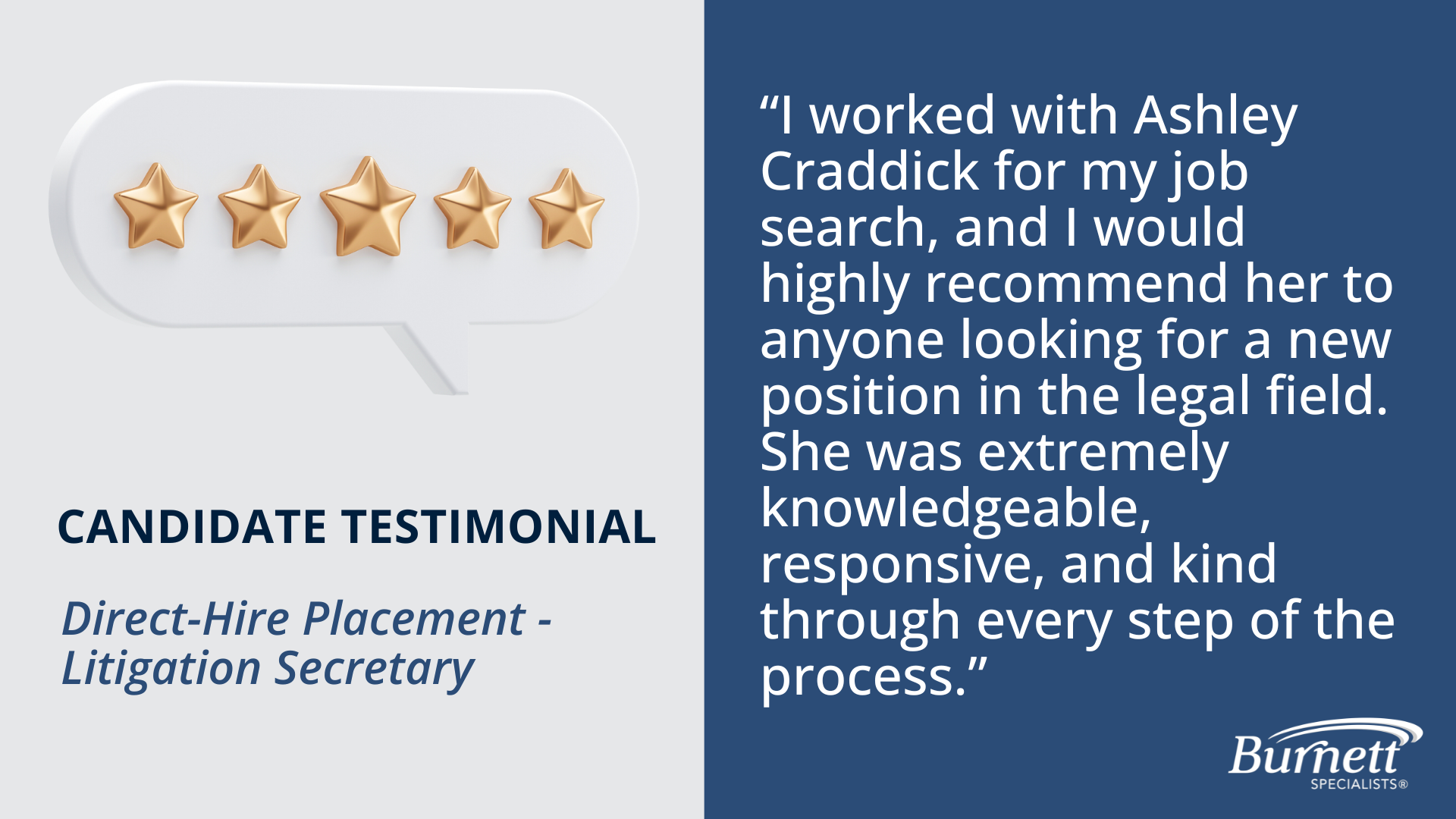 “I worked with Ashley Craddick for my job search, and I would highly recommend her to anyone looking for a new position in the legal field. She was extremely knowledgeable, responsive, and kind through every step of the process. Thank you to Ashley for helping me find my amazing new job!“