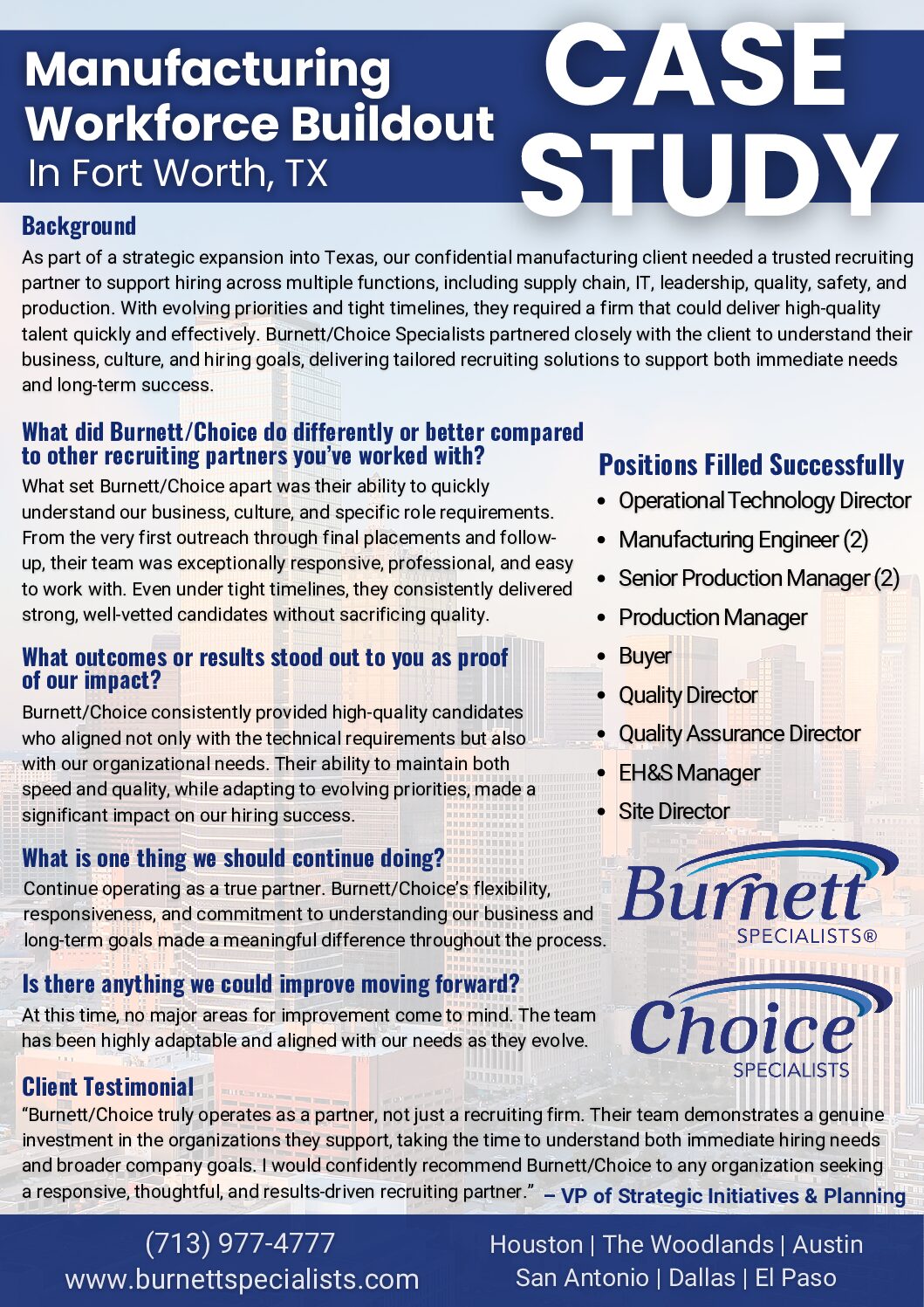Read how Burnett Specialists supported a manufacturing client with a large‑scale workforce buildout, delivering skilled talent across operations, production, and leadership roles.
